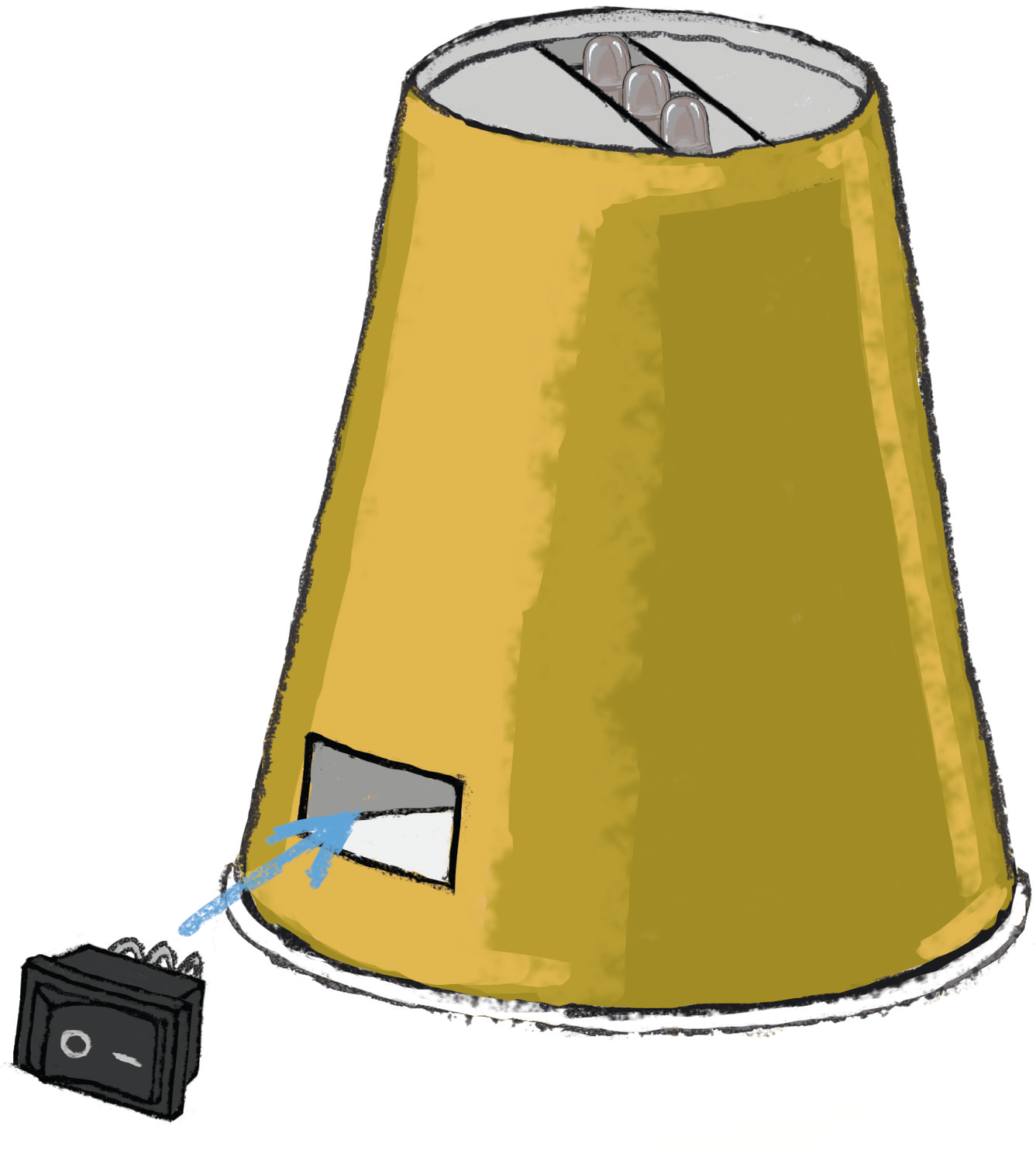 В стенке второго стаканчика вырежьте отверстие под переключатель, а в донышке - под линию светодиодов. Вставьте часть стаканчика со светодиодами внутрь второго стаканчика. Вставьте переключатель в отверстие под него. |