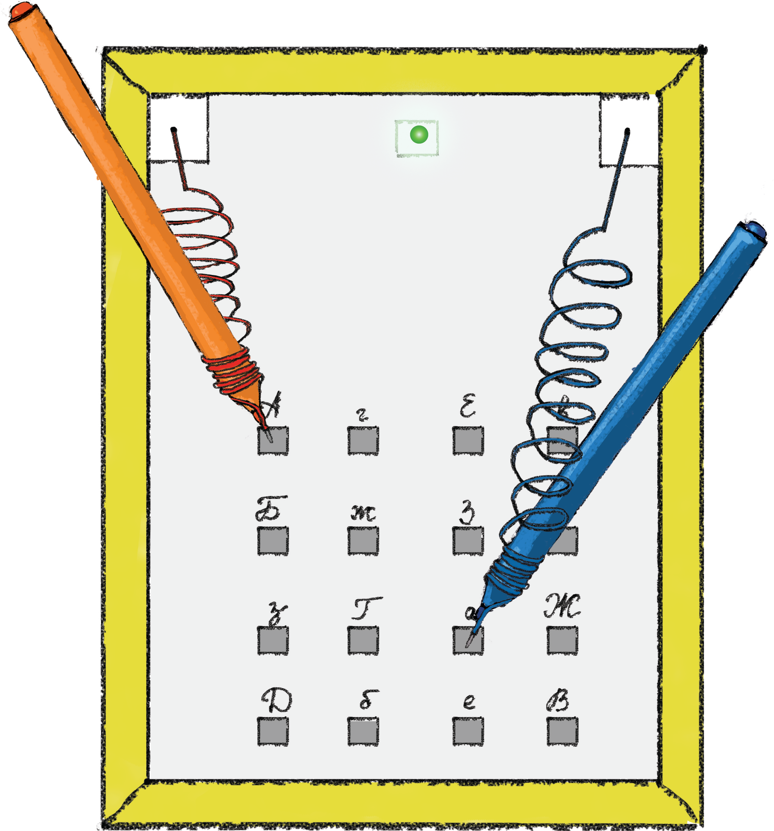 Закрепите провода щупов на двух карандашах. На отдельном листе картона нарисуйте задание викторины и вырежьте отверстия в местах расположения квадратов фольги. Наложите задания на основу игры - правильные ответы должны быть над теми квадраты, которые соединены проводами. |